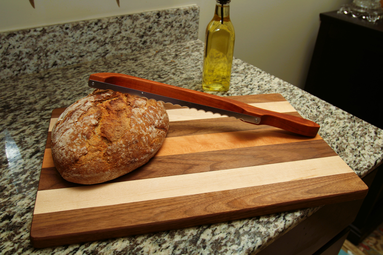 Elevate your kitchen with this beautifully handcrafted bread board and matching bow knife set. Made from rich walnut, maple and cherry wood, each board showcases natural grain patterns that make every piece one of a kind. The bow knife, crafted from cherry wood and fitted with a stainless steel blade, effortlessly slices through fresh loaves, pastries, and more.